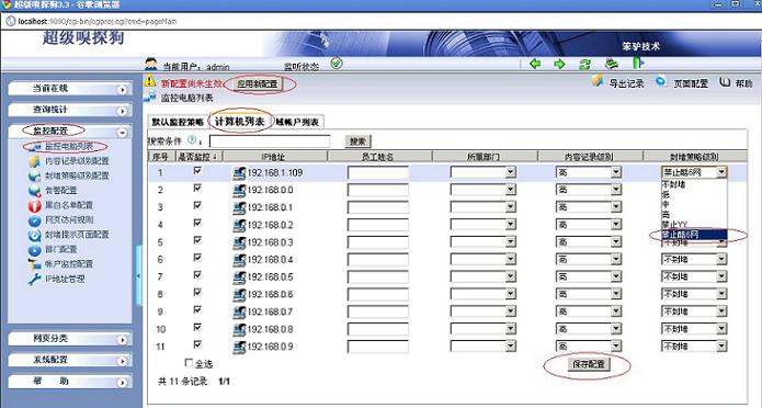 (3)在“監(jiān)控配置-- >監(jiān)控電腦列表-- >計算機(jī)列表”中應(yīng)用封堵規(guī)則,如下圖所示: