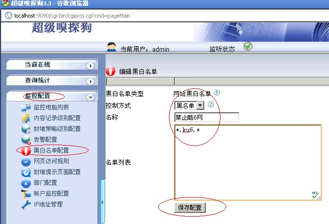 (1)打開超級嗅探狗,在“監(jiān)控配置-- >黑白名單配置-- >新增網(wǎng)站黑名單:禁止酷6網(wǎng)”,配置如下如所示: