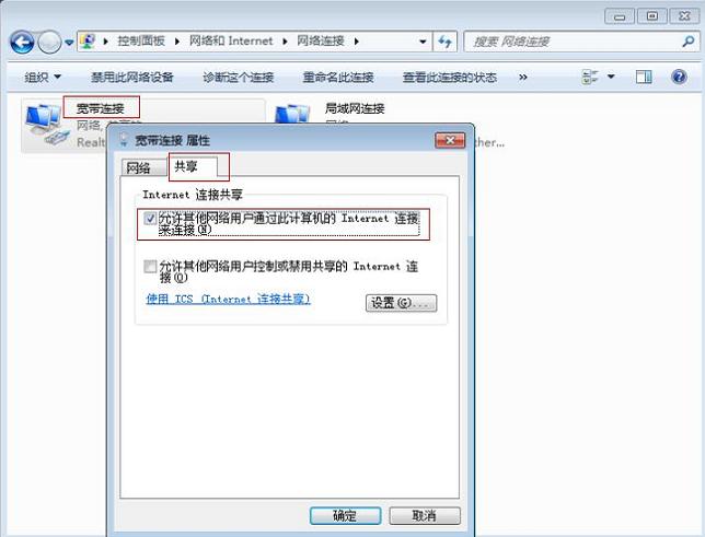 進入“控制面板”->“網絡和Internet”->“網絡連接”,右鍵單擊接Internet那塊網卡的屬性(本例中是“寬帶連接”),單擊共享選項卡,將“允許其他用戶通過此計算機的Internet來連接”的復選框勾選上,如下圖。