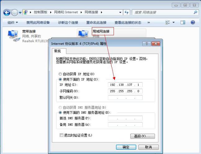 上述設置完成之后,“局域網連接”會獲得一個新的靜態(tài)IP地址和配置,在win7上,獲取結果如圖: