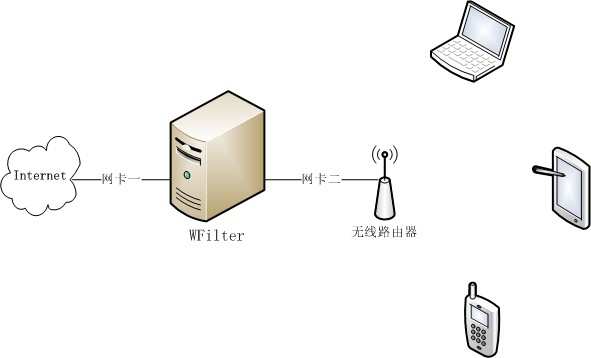 有些小型局域網只通過一個無線路由器接入,而且沒有支持鏡像的交換機或者路由器。這樣的情況下,可以采用本文中演示的方案:“把安裝WFilter的電腦配置為網關,然后把無線路由器當成無線AP來提供無線服務”。
