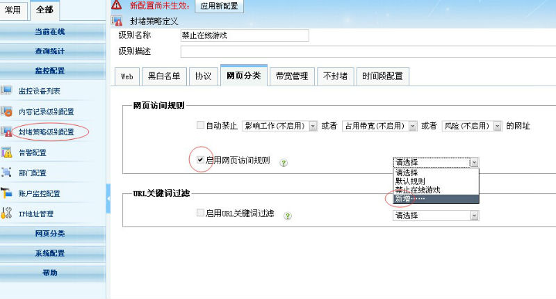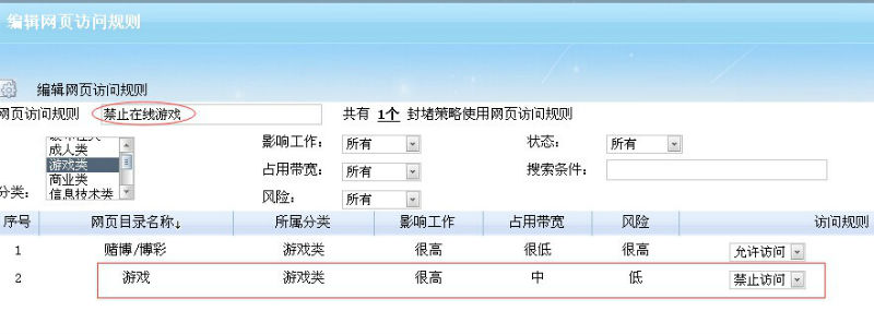 2.編輯網(wǎng)頁訪問規(guī)則,禁止“游戲”分類并保存,如下圖所示: