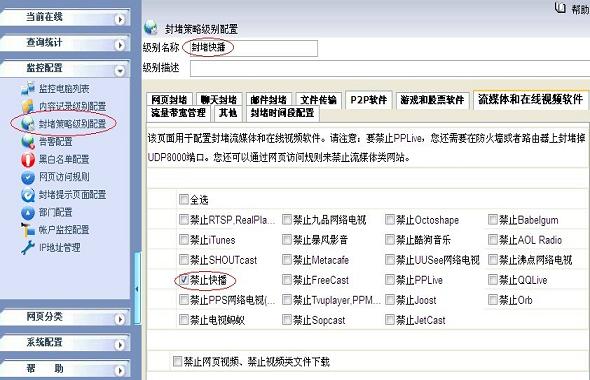 2.2 在“監控配置->封堵策略級別配置”新增一個“ 新增級別”,級別名稱為禁止快播(Qvod)。在“流媒體和在線視頻軟件”標簽下選中“禁止快播”的復選框點擊保存,如下圖所示: