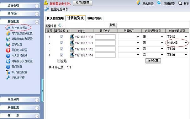 2.3 在“監控配置->監控電腦列表”里,選中要封堵的主機和封堵策略級別,保存配置并應用封堵策略,如下圖所示: