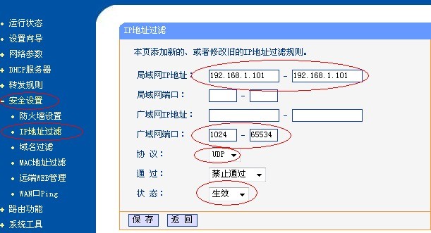 2.1 配置路由器,封堵UDP端口1024-65534。打開“安全設置->IP地址過濾”,新增規則,如下圖所示: